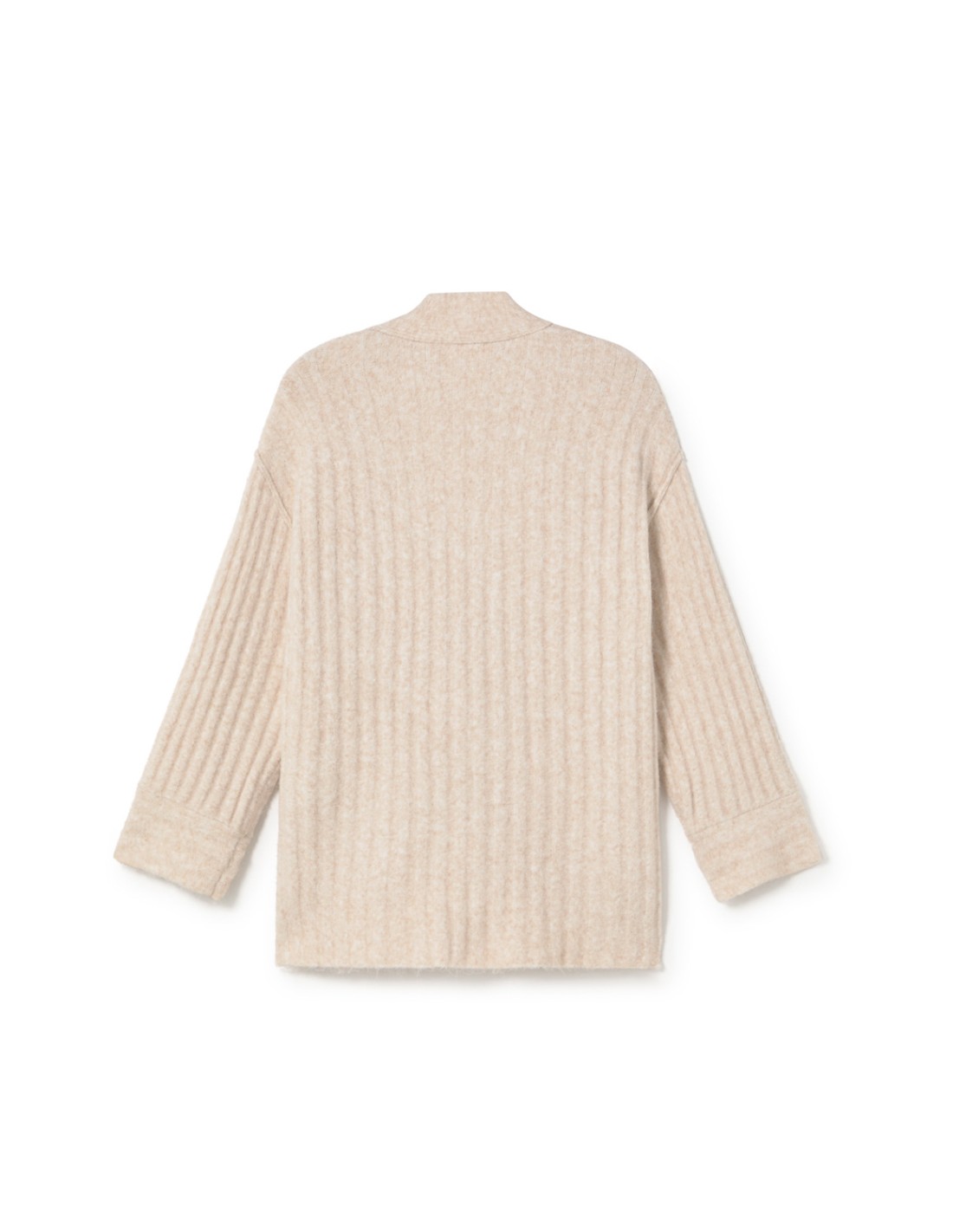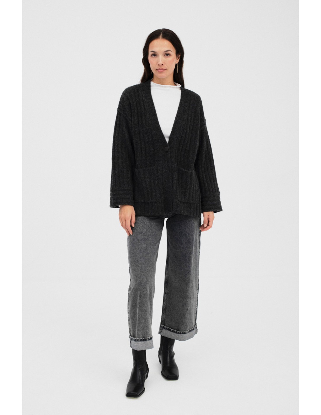 Ribbed, knitted cardigan detailed with horizontal ribbed cuffs folded to the outside. Button front opening and side slits. It features two front pockets. Wear it with Bukon and Busan accessories.