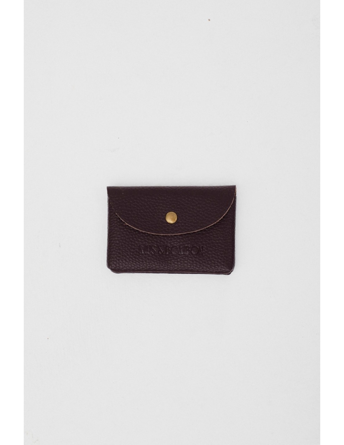Small leather purse with a snap button closure in the centre. It has the Mus&Bombon logo engraved on the outside.