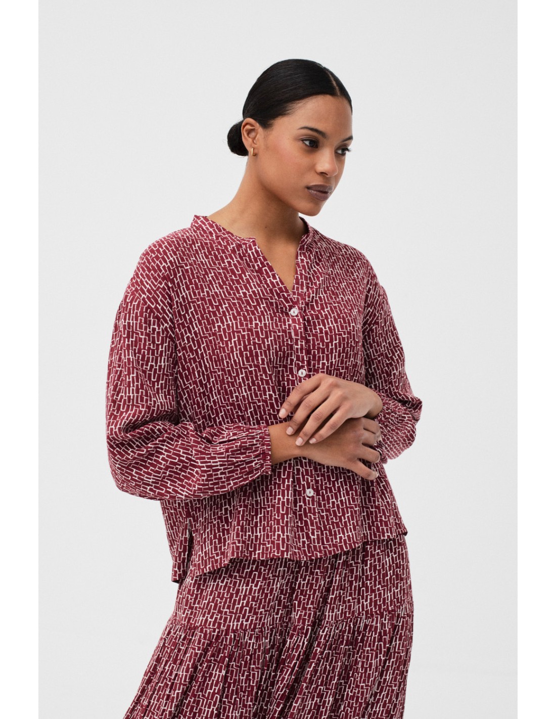 Annex is a printed shirt with a mao collar, puffed sleeves and front button fastening. Combine it with the Arrayan skirt for a total look.
