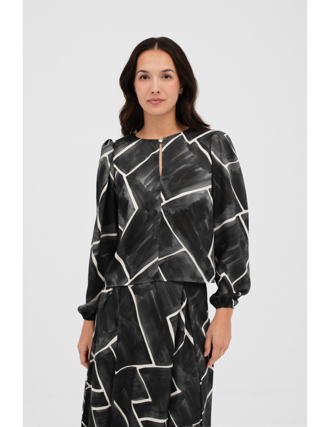Printed blouse with long puffed sleeves, a yoke detail on the back and a teardrop neckline with a fancy metallic button. Match with the Vasastan skirt for a romantic look.