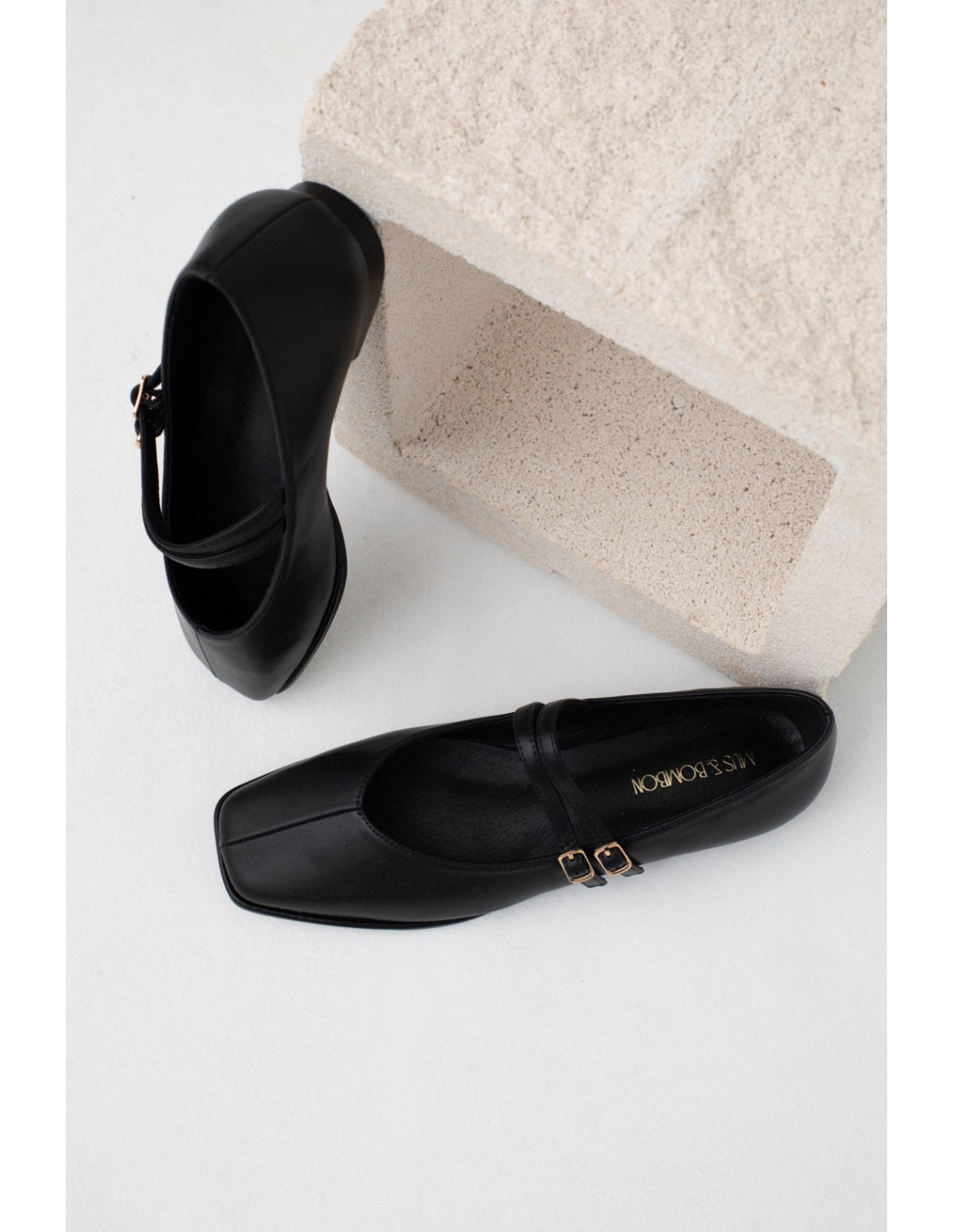 Ballerinas with two straps and golden buckles, square toe and simple stitching details. Rubber sole and low heel. Ideal for all occasions.