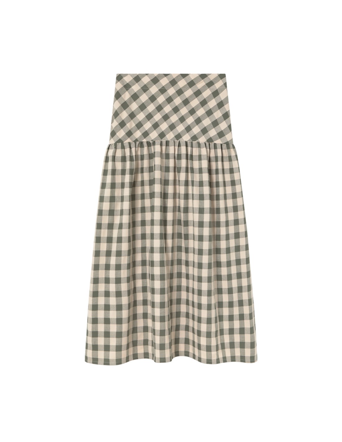 Vichy long skirt with a fitted yoke and a hip-length flounce, invisible zip fastening at the side and flat elastic at the back. Combine it with the Marlene blouse and the Whitehall bag.