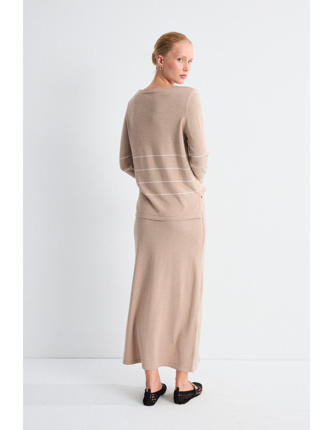 Long, fine knit skirt with elasticated waist and straight cut. Its soft fabric and fluid drape make it a comfortable and elegant garment. Ideal for wearing with the matching Celeno jumper.