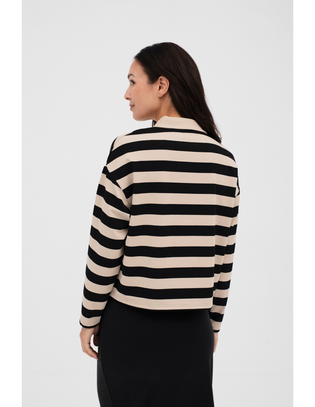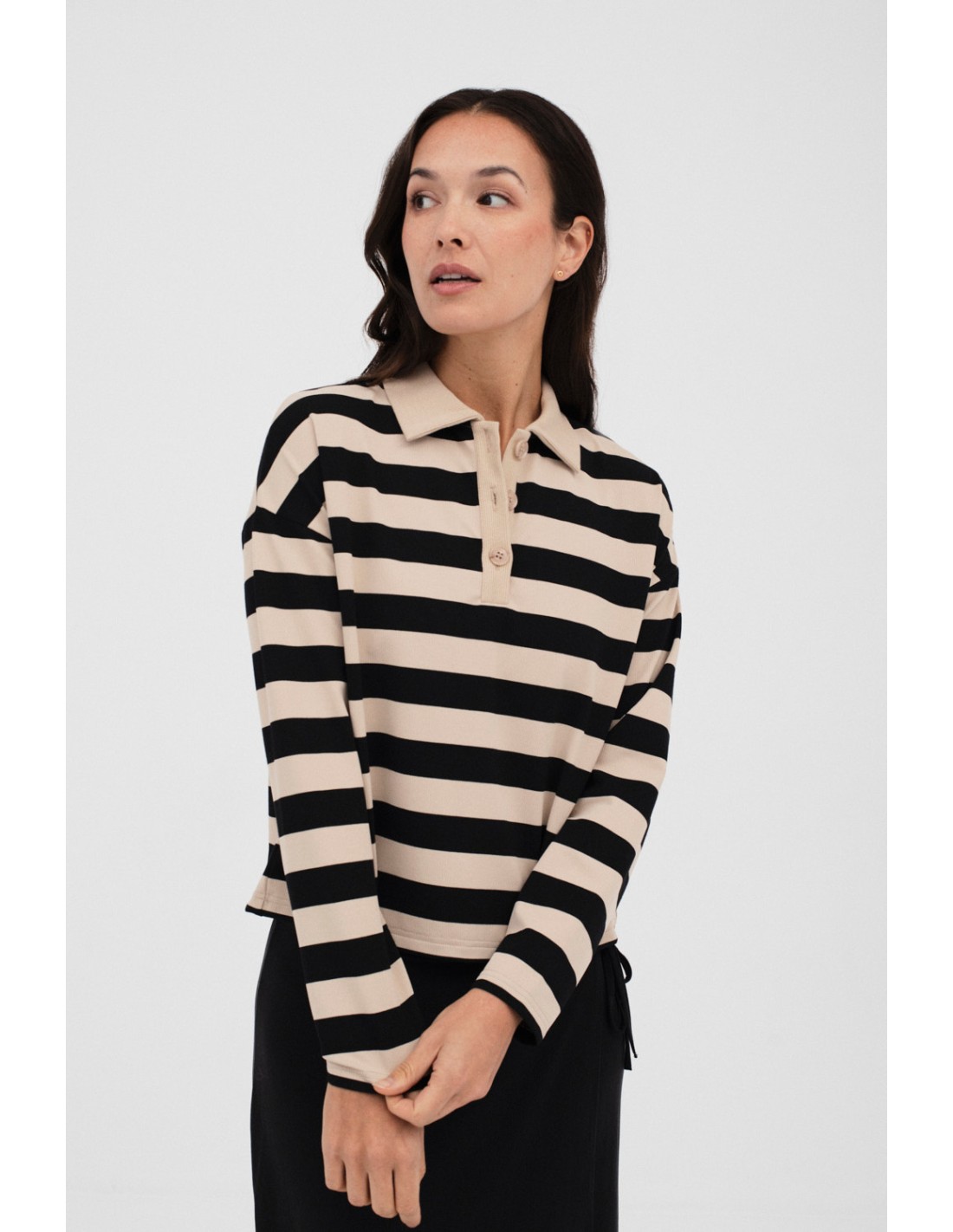 Pedralbes is a long-sleeved polo shirt with wide stripes. With a ribbed collar and placket in the same tone. Ideal for a casual look.