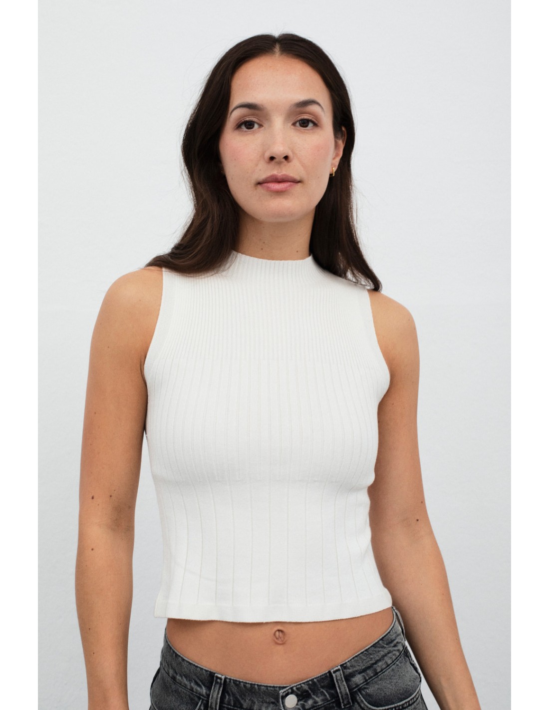 Sleeveless knitted top with a design that combines three different types of ribbing on the body. It has an elegant 2x2 ribbed turtleneck and fantasy stitch details on the armholes and hem. It goes perfectly with the Sufouh cardigan and Safa skirt.